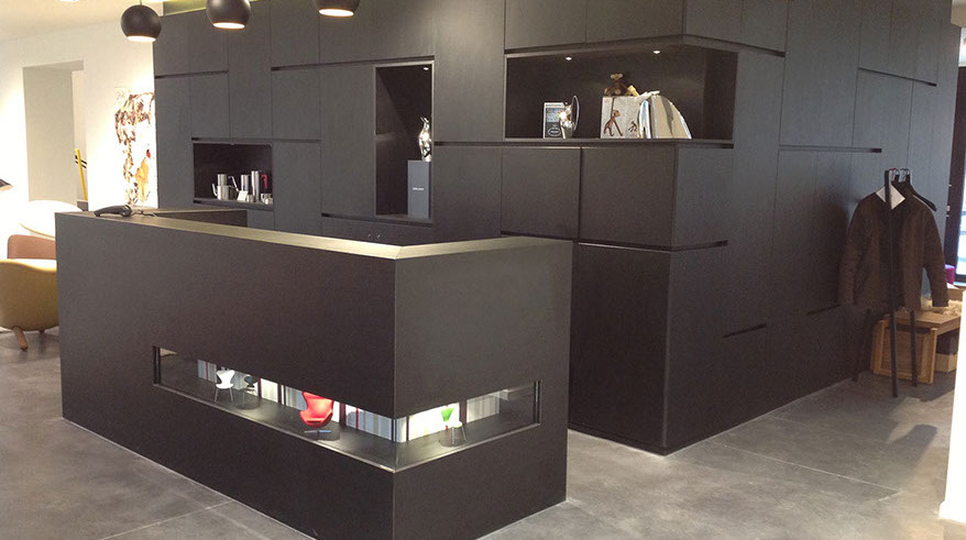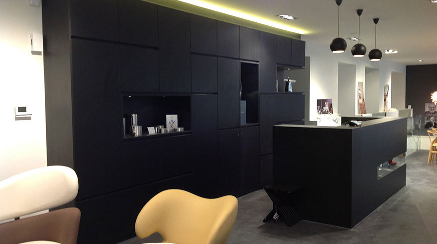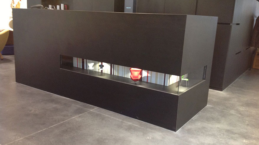 Omdat de klant enkele stoelen in klein formaat hebben gekregen van de fabrikant, wilden we ook een soort “etalage” voor deze voorwerpen. Dit heb ik verwerkt in de balie. Op de achtergrond van deze nis heeft de klant de barcode van hun logo laten terugkomen..