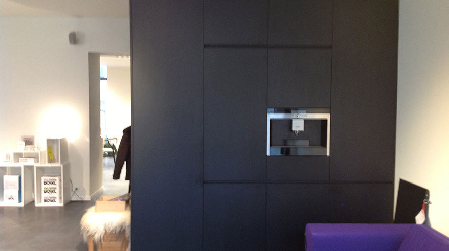De kitchenette is ook verwerkt met het koffiemachine in zicht. Dit vonden we niet storen dat dit zichtbaar bleef, omdat dit ook een soort van ‘design’ is. Links van het koffieapparaat staat is een deur die volledig op en kan, en waarachter een spoelbakje verborgen zit, onder de koffiezet staat een afwasmachine. Op de hoek van de “gevelbekleding “ naar de kitchenette konden de greepbalken niet doorlopen.