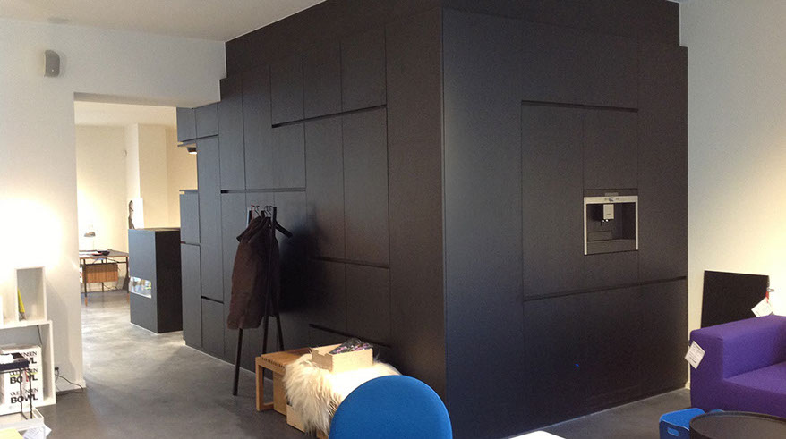 Ik wilde ook een soort verbinding tussen de kitchenette en de achterkasten van de toonbank. Maar omdat ik hier weinig plek had, zijn deze kasten enkel maar 10cm diep. Dus eigenlijk is dit gewoon een soort van gevelbekleding. De deuren kunnen wel opengaan, omdat de klant hier af en toe andere panelen zal hangen met reclame of met uitleg over de ontwerpers.