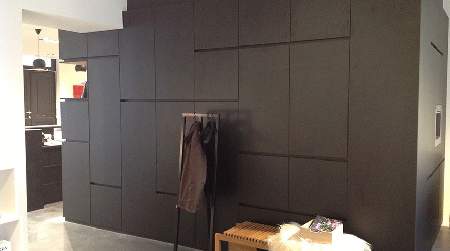 Dit is een winkel voor allemaal designspullen. Zowel de kastenwand als de balie moest er dus niet “gewoon” uitzien en moest een bepaalde uitstraling hebben. Omdat het toch wel over een grote wand gaat wilde ik een speelse wand creëren.